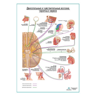 Черепные нервы (двигательные и чувствительные волокна). Схема плакат глянцевый А1+/А2+